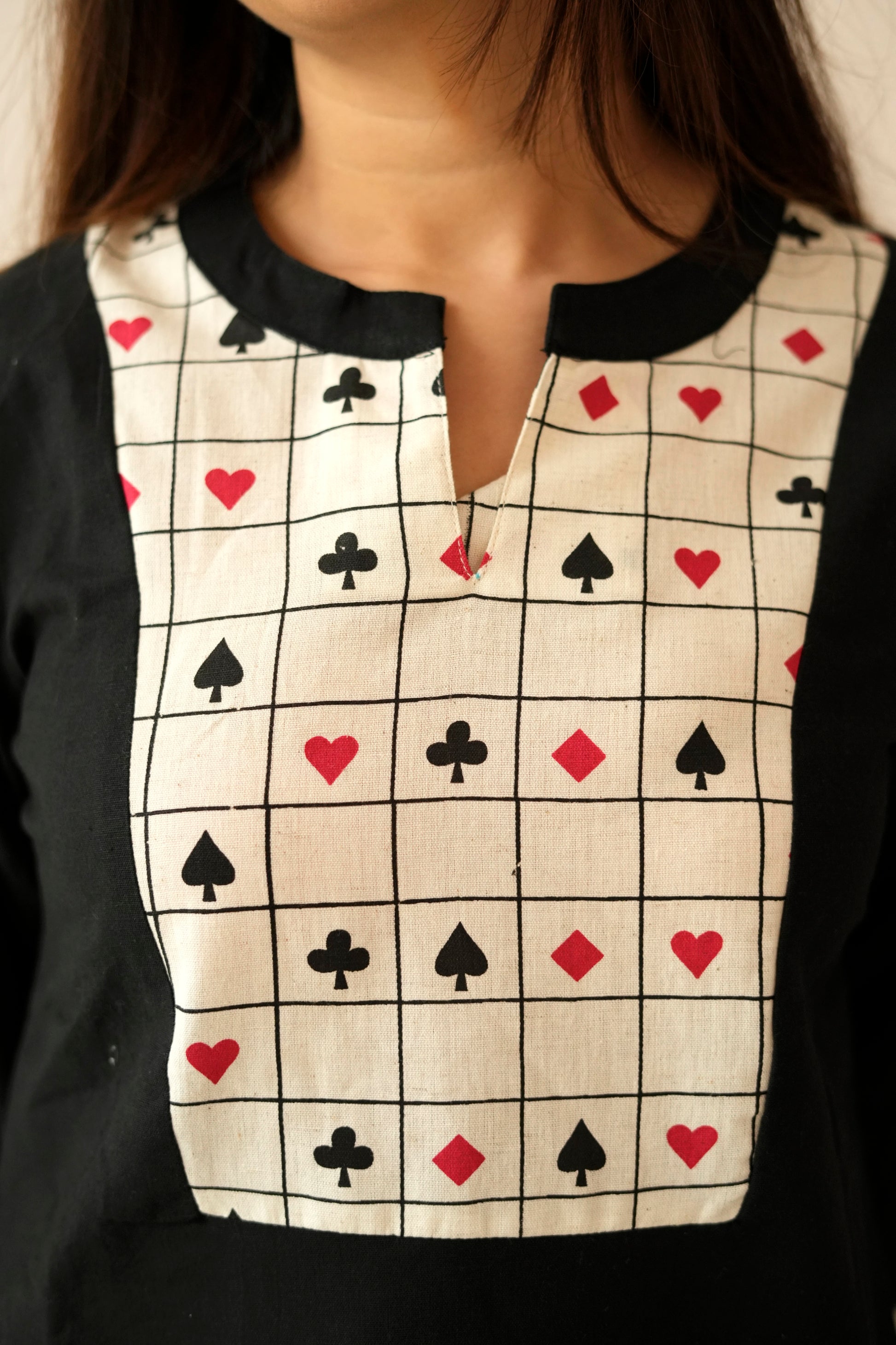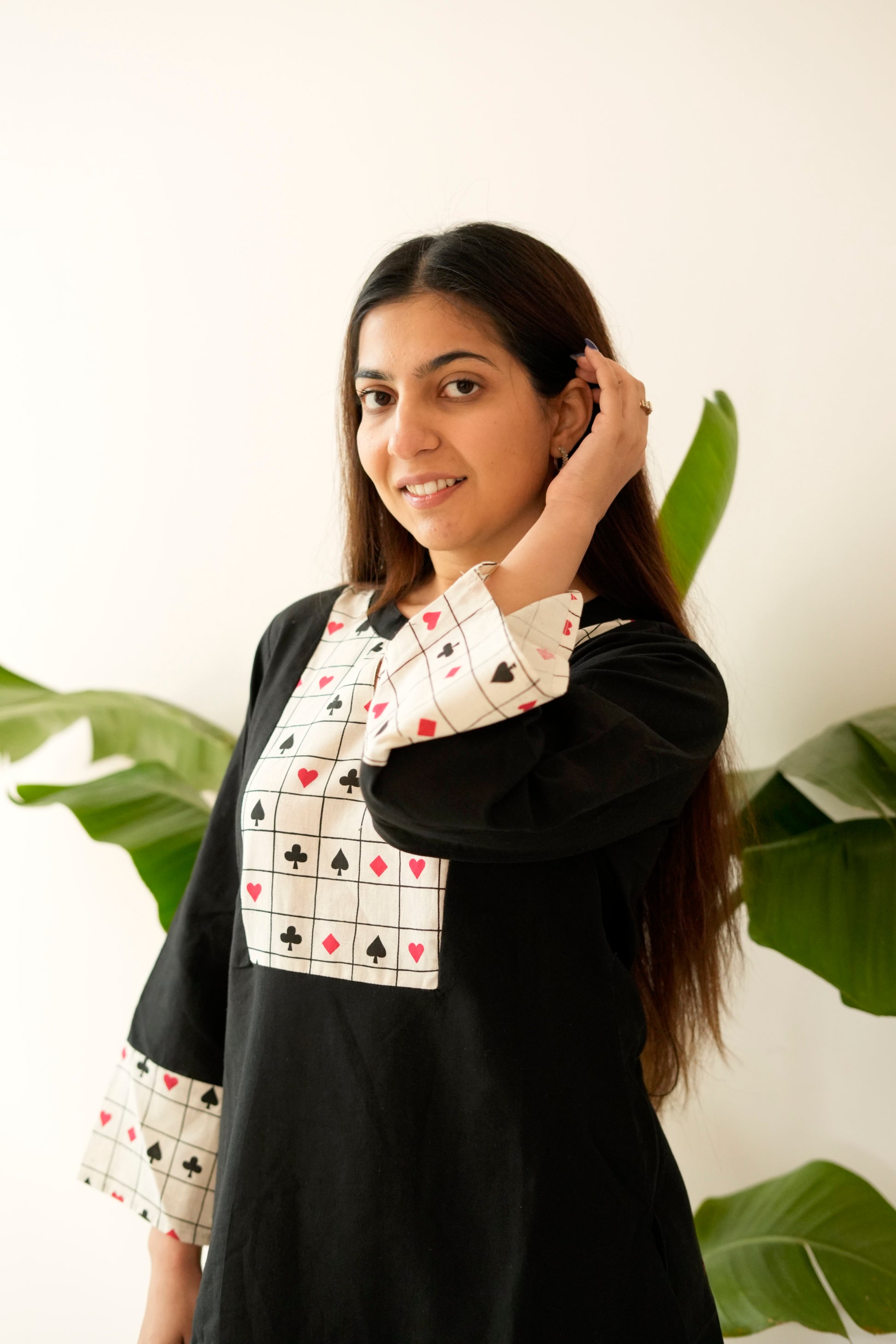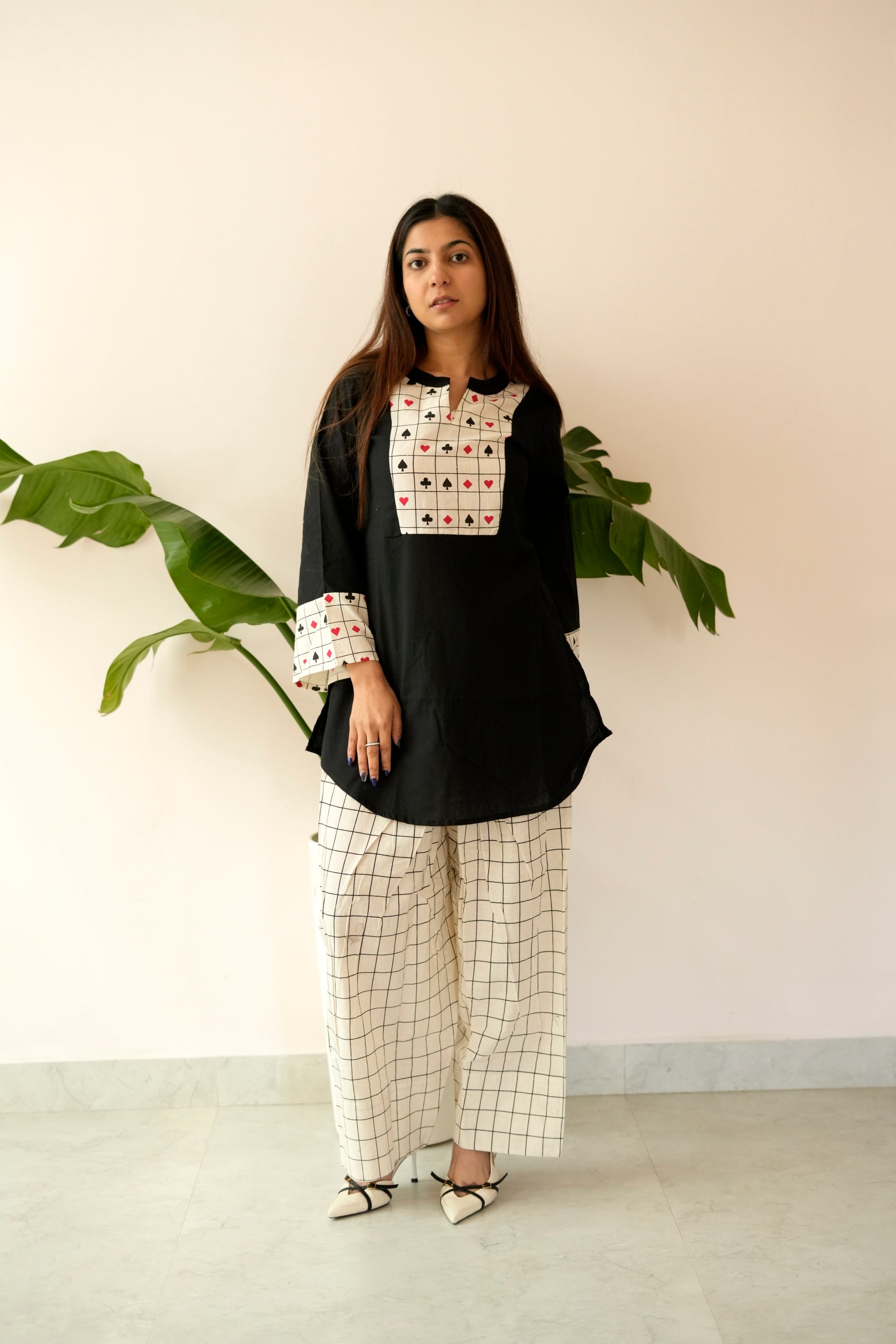 Step into playful sophistication with our Tash Patti Co-ord — a refreshing fusion of comfort, modern design, and unique printed detailing. Crafted from breathable, smooth cotton fabric, this set features a chic black kurta adorned with eye-catching card-symbol patchwork on the yoke and sleeves, paired with wide-leg ivory grid pants that add a clean, structured contrast.