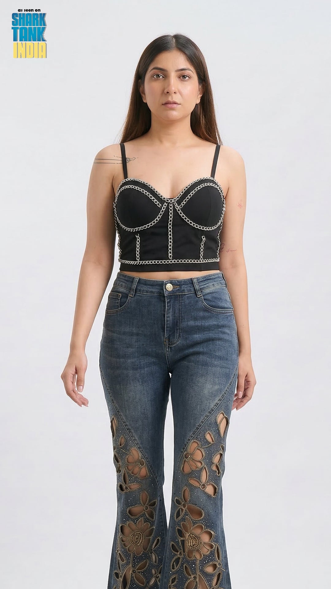 The highlight of this piece is the stylish silver chain detailing that outlines the bust and panels of the top. This unique chain-inspired embellishment adds a bold, edgy vibe while creating a beautiful contrast against the deep black fabric. The intricate design gives the top a designer-inspired feel, making it a true statement piece.