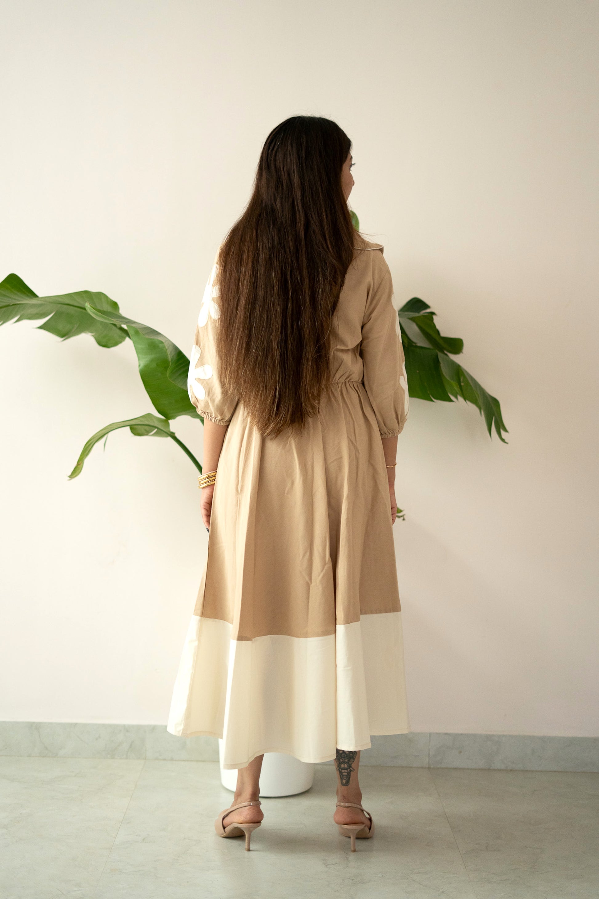 Effortlessly graceful and contemporary, our “Valet” dress blends structured design with soft, feminine charm. The dress features a soothing beige tone complemented by a contrasting ivory panel at the hem, offering a modern yet timeless aesthetic.