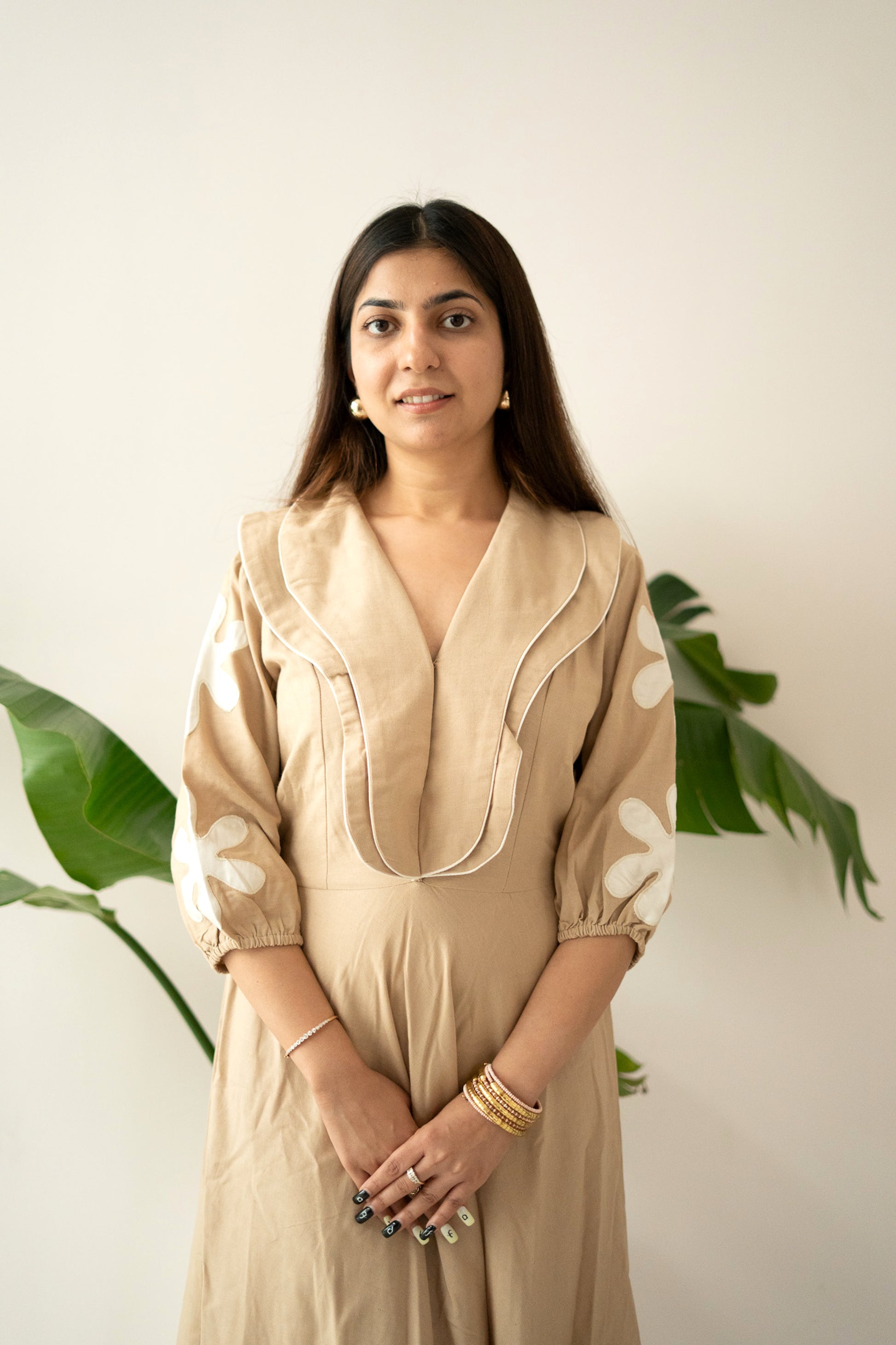 Delicately crafted from breathable cotton-blend fabric, it showcases statement bishop sleeves with bold white petal motifs and a layered neckline that frames the face beautifully. The relaxed yet flattering fit makes it perfect for both refined daywear and understated evening elegance.