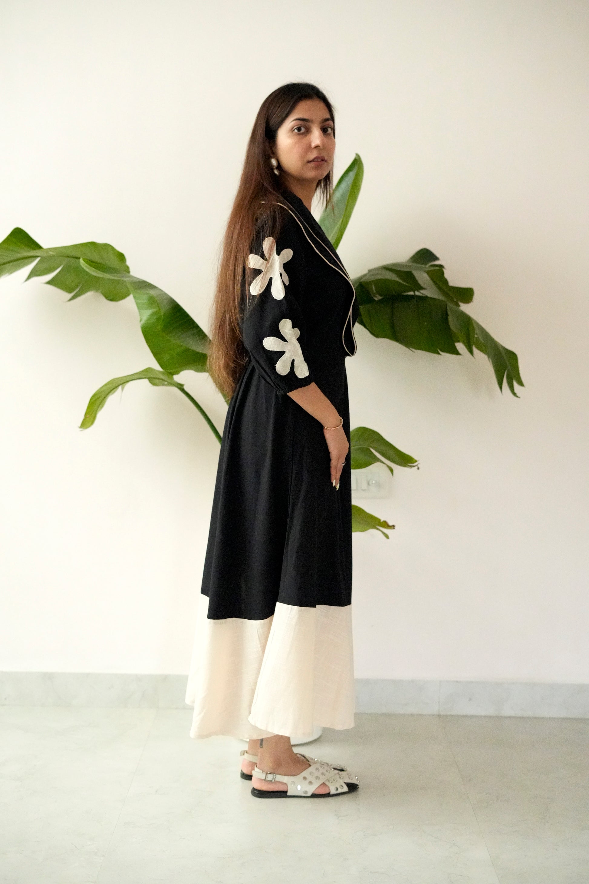 Crafted from soft, breathable cotton-blend fabric, the dress features a flowy A-line structure with an ivory underlayer that adds movement and dimension. The deep V-neckline is framed with delicate contrast piping, while oversized floral appliqués on the sleeves lend a touch of playful sophistication. Whether styled for a daytime brunch or an evening soiree, “Valet” is the epitome of refined comfort.