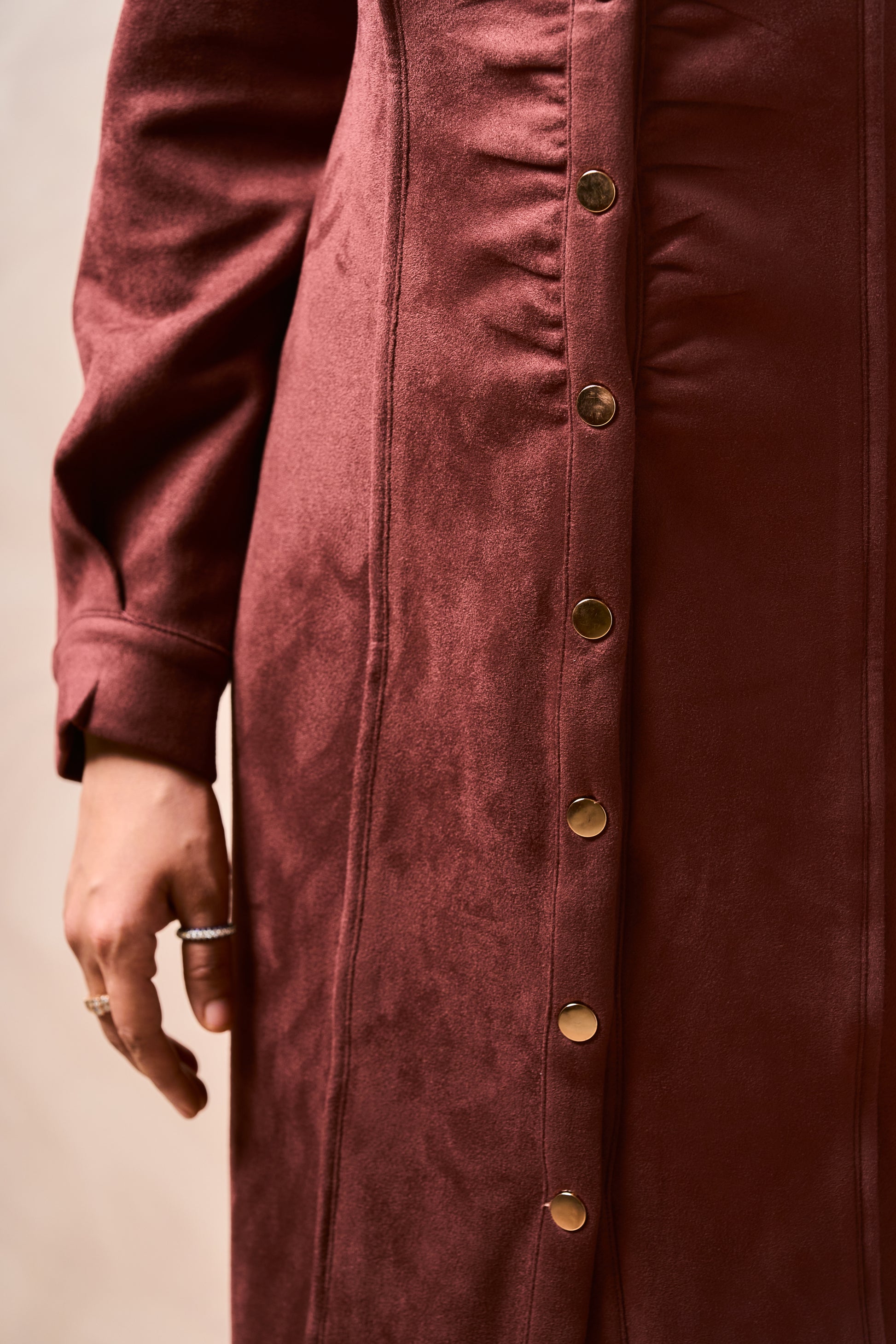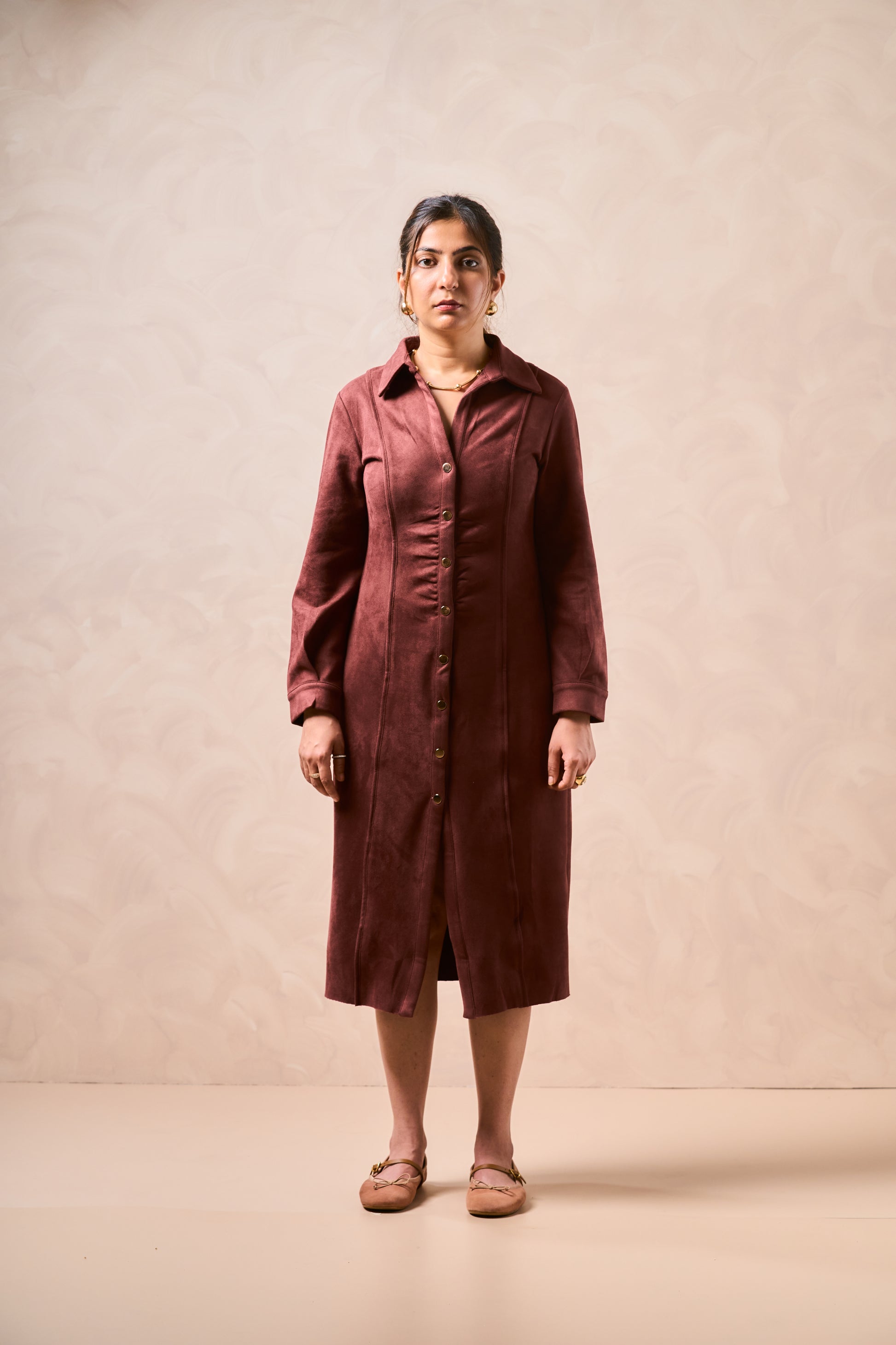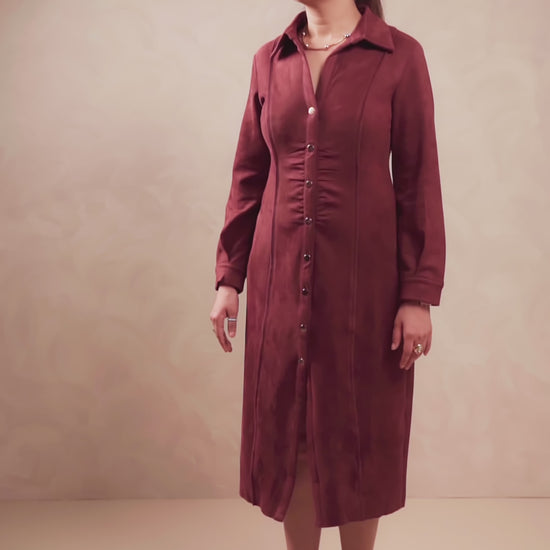 Command the room without raising your voice – the Wealthy Lady dress speaks volumes with its tailored lines and timeless grace. Crafted in a rich wine brown hue with a suede-like finish, this button-down midi radiates quiet luxury.