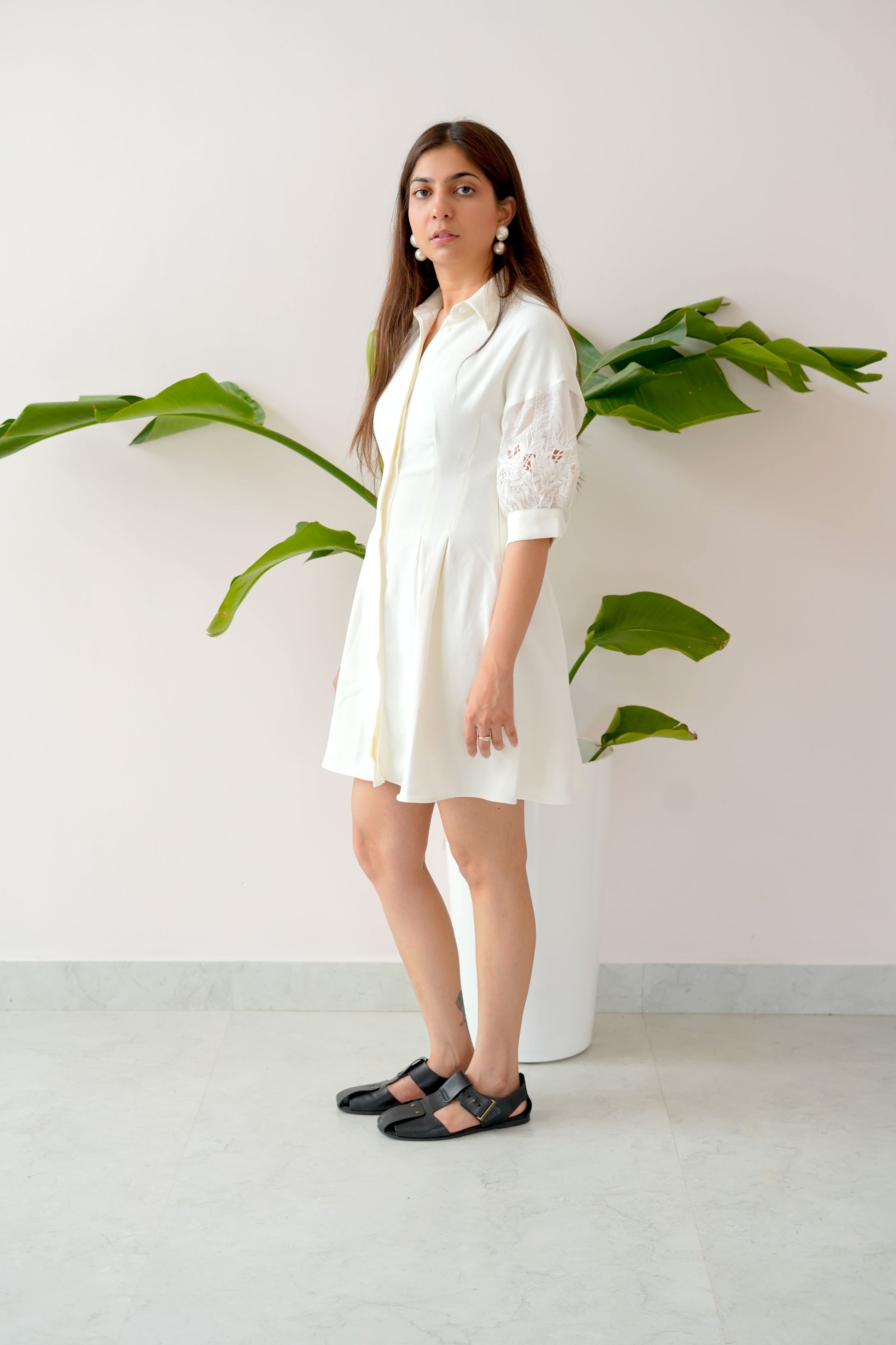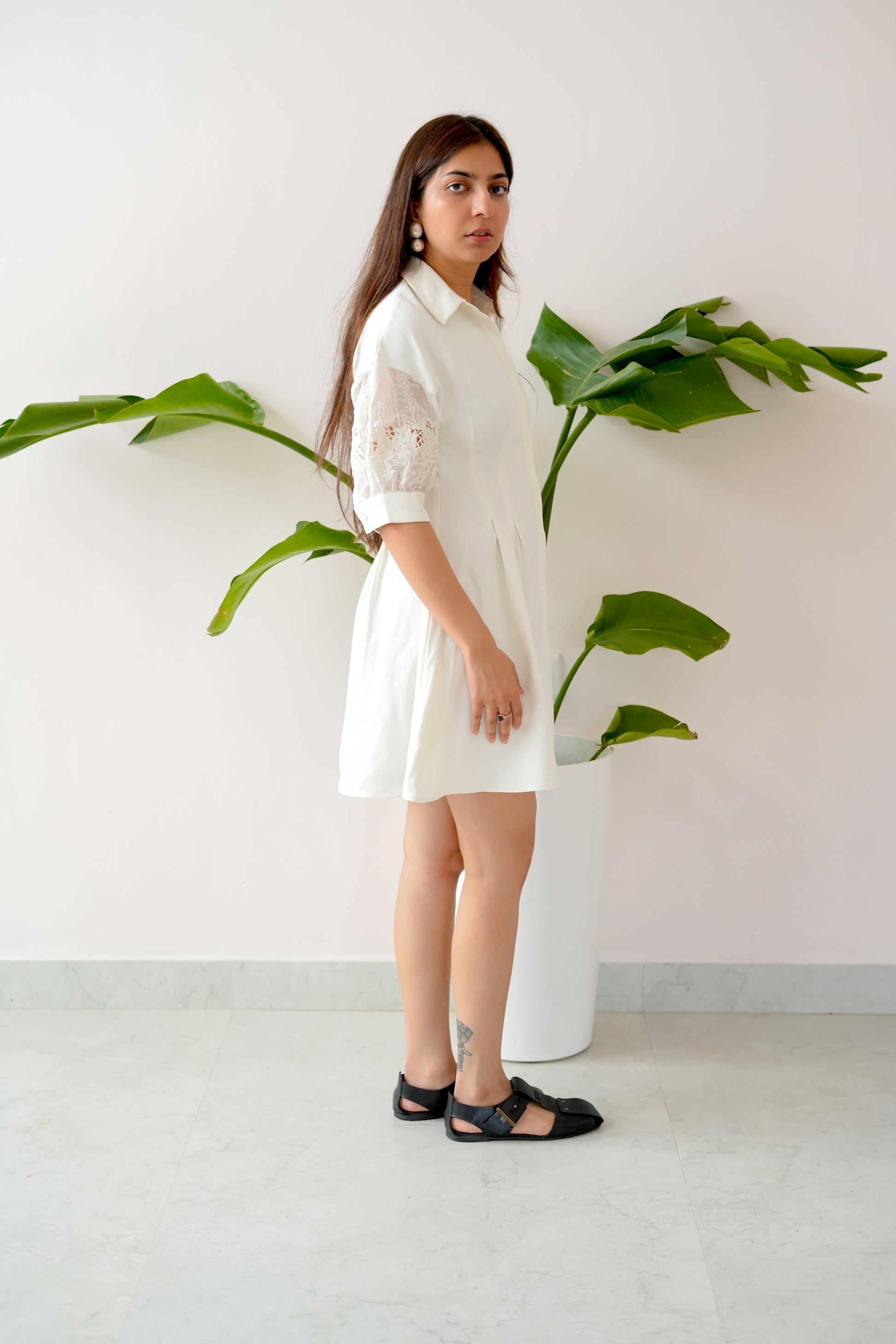 Float into elegance with White Feather – a dreamy white shirt dress designed to make every step feel effortless. With its classic collared neckline, pleated flare, and delicately embroidered lace sleeves, this mini dress strikes the perfect balance between crisp structure and romantic detail.