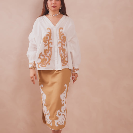Refined, elegant, and effortlessly stylish — the Young White and Rich Embroidered Shirt is a wardrobe essential for women who love understated luxury. Crafted in breathable white fabric, this relaxed-fit blouse features voluminous sleeves, a flattering V-neckline, and intricate caramel-toned embroidery that adds depth and sophistication to your look.